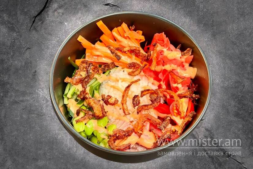Рис, тунець гриль, соус спайсі, огірок, бебі морква, боби едомаме, помідори чері, імбир маринований, цибулевий кранч.