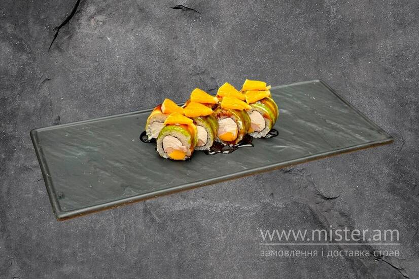 Креветка тигрова, манго, авокадо, крем сир, соус унагі, апельсин, рис, норі.