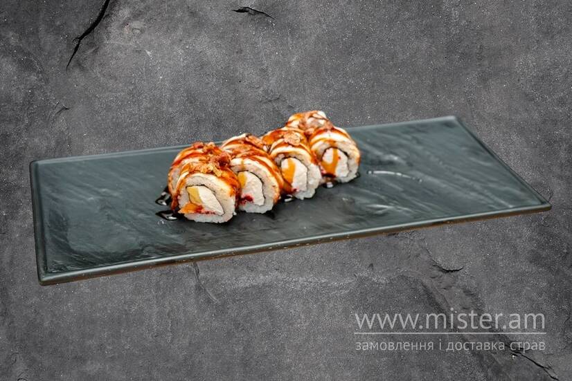 Вугор, авокадо, ікра масаго, крем сир, соус унагі, цибулевий кранч, рис, норі.