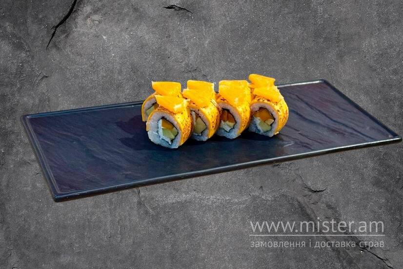 Манго, авокадо. апельсин, крем сир, сир чеддер, рис, норі.