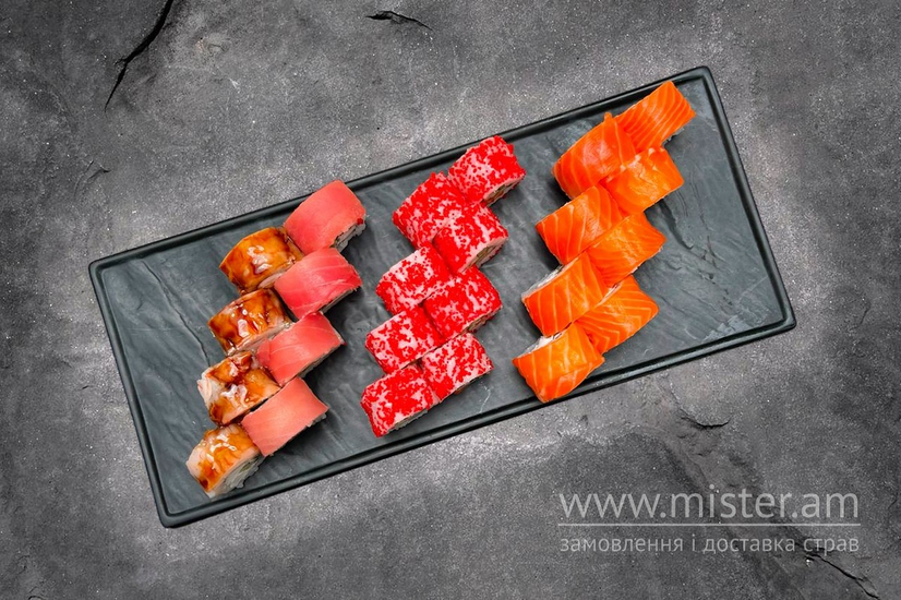 - Каліфорнія дует з лососем і тунцем в ікрі масаго.