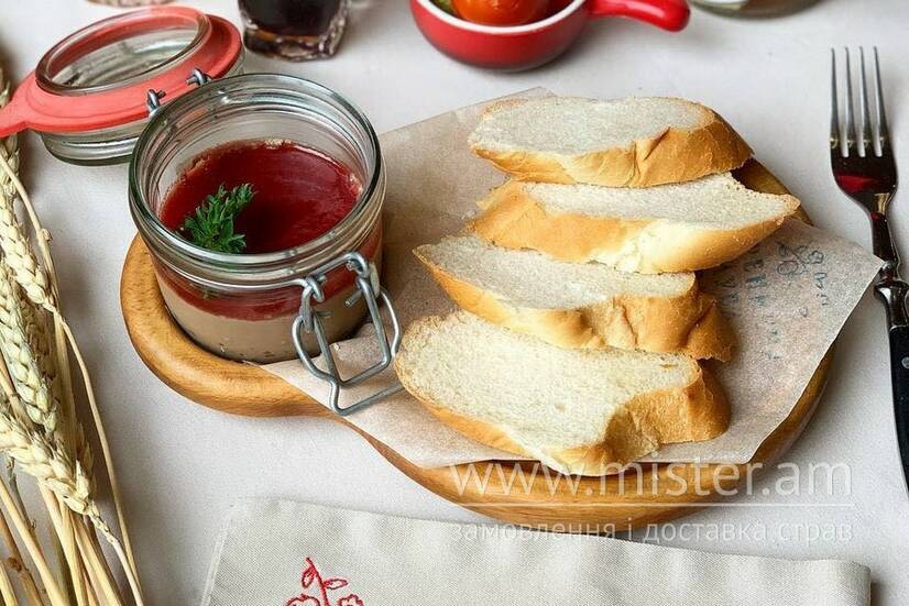 Ніжний паштет з курячої печінки, тушкований у вершках, з обсмаженою куркою та цибулею. Подається з малиновим соусом та грінками з багету.