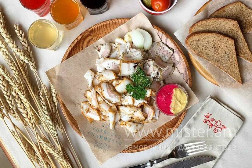 Шматочки сала з прорізом мариноване в спеціях (паприка та лавровий лист). Подається з часником, хроном та гірчицею, прикрашається петрушкою.