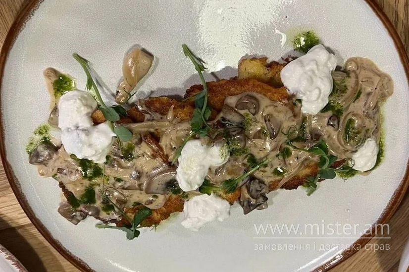 Хрусткі деруни під ароматним вершковим соусом з грибів (печериць, глив, білих) з солоною бринзою прикрашені зеленою олією та мікрогріном.