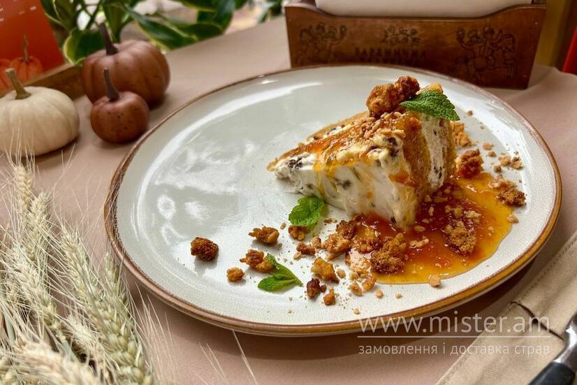 Ніжний морквяний бісквіт з вершково-сметанковим кремом, чорносливом та фундуком.