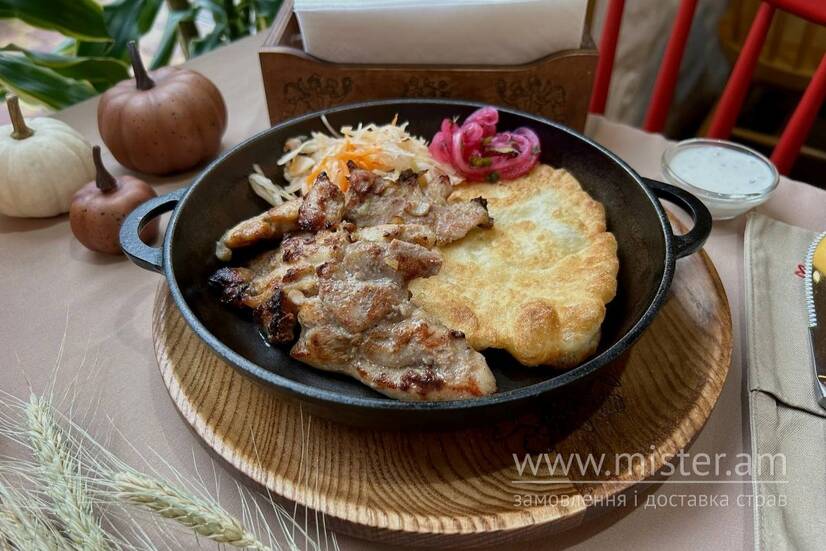 Ніжне м’ясо курча зі смаженим лангошем, квашеною капустою, кримською цибулею та соусом зі сметани, часнику та кропу.