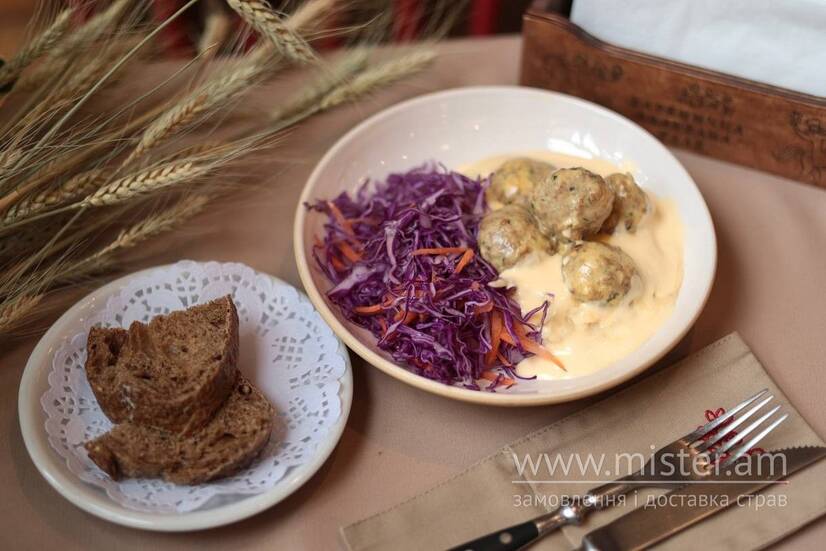 Варенична Балувана Галя Дитячий сніданок з вершковим пюре, індичими фрикадельками в сирному соусі