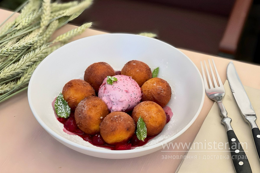 Ніжні сирні пончики “як у дитинстві”, приготовлені на основі натурального кисломолочного сиру . Подаються з ароматним вишневим соусом та фірмовим морозивом з маком і вишнею на основі вершків та згущеного молока.