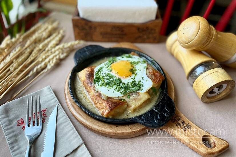 Варенична Балувана Галя Запечені млинці з шинкою та сиром сулугуні та смаженим яйцем