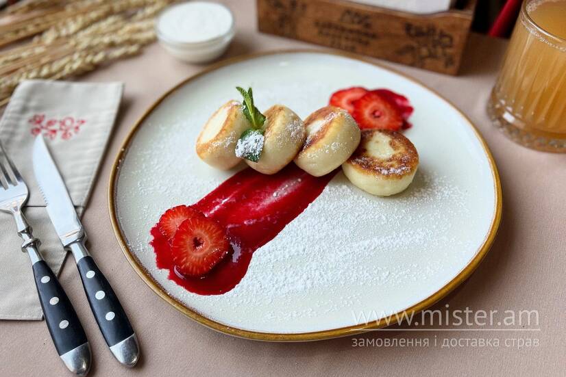 Запечені в духовці сирники з домашнього сиру. Подаються з ягідним соусом та сметаною.
