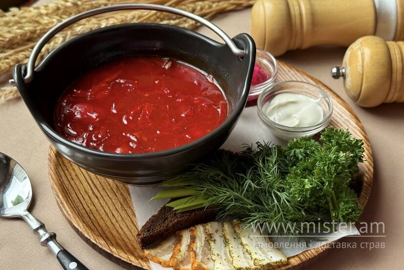 Борщ на основі яловичого бульйону, з мʼясом яловичини, копченої груші, моркви, буряка, цибулі, картоплі, квасолі, перцю та помідори пілаті. Подається зі сметаною, салом, зеленню та шматочком бородинського хліба.