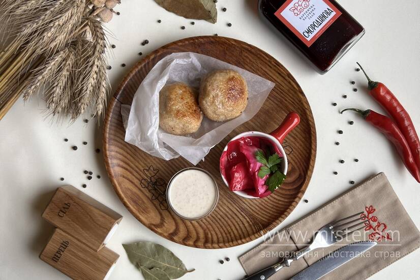 Котлети з філе щуки з додаванням мʼяса курятини, поєднується з маринованою капустою пелюсткою та соус хрін.