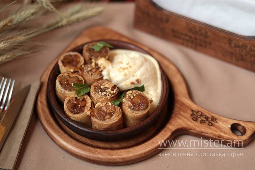 Солодкі млинці з яблуками, корицею, вершково-ванільним кремом, крихтою фундука, м’ятою.