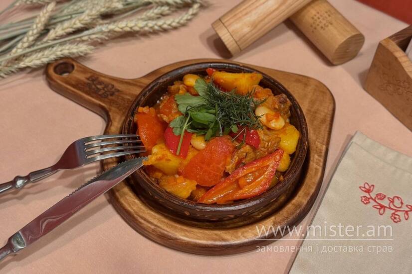 М’ясна, тушкована страва зі свинини, томатів, болгарського перцю, картоплі, цибулі та томатного соусу.
