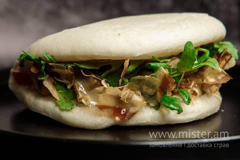 Парова булочка БАО, мідії, помідор, руккола, сирний соус, стружка тунця.