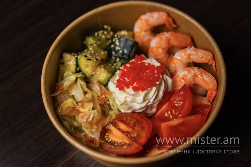 Рис, фірмовий соус до рису, тигрові креветки під соусом sweet-чилі, помідор Чері, салат Айсберг, биті огірки, гірчиця американська, крем-сир, ікра Тобіко, кунжут.