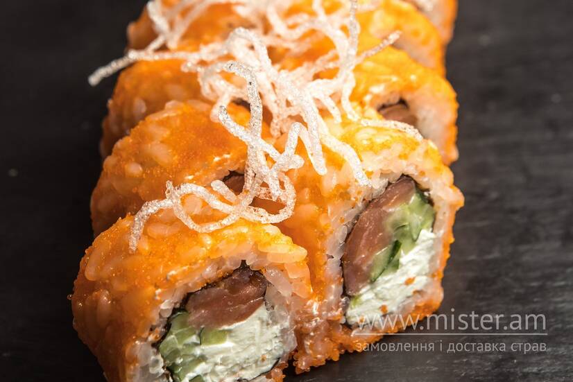 Рис, норі, крем-сир, огірок, копчений лосось, ікра тобіко.