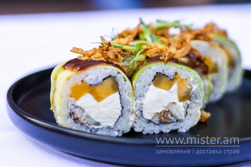 Рис, норі, крем-сир, авокадо, вугор, манго, соус унагі, цибулевий кранч.