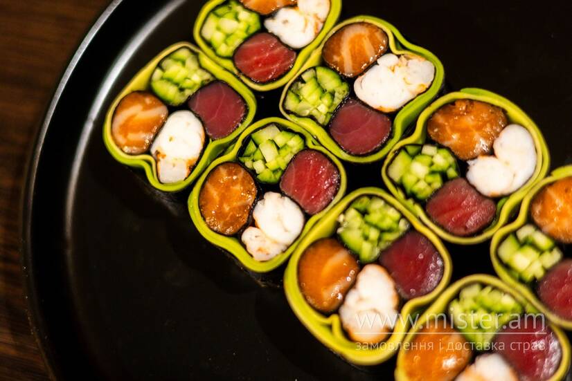 Норі, авокадо, свіжий лосось, тигрова креветка, тунець, огірок.