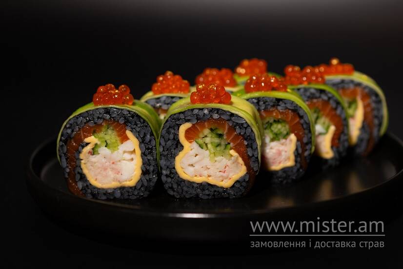 Розкішний рол з чорним рисом, свіжим лососем, ніжним чеддером, огірком, авокадо, крабом та тигровою креветкою.