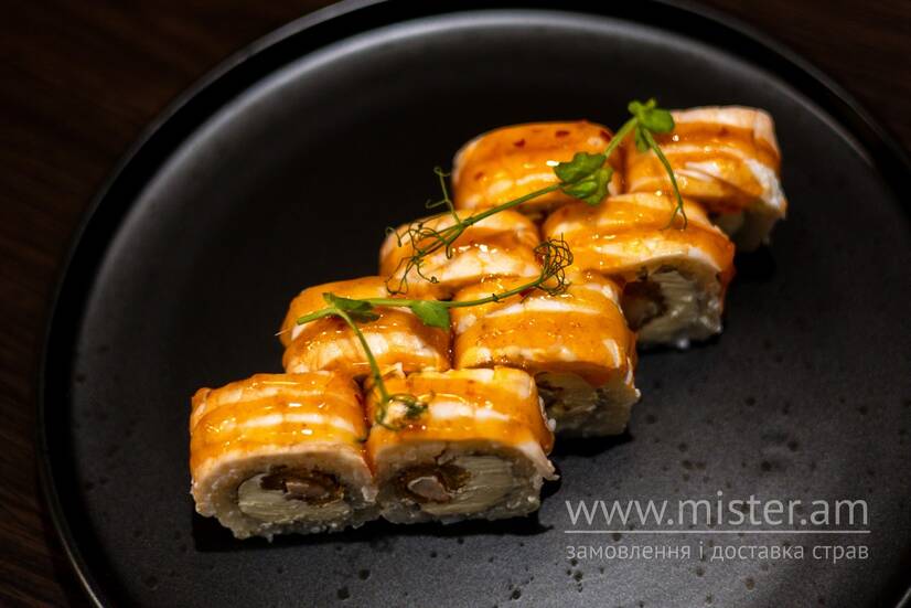 Рис, норі, креветка тигрова, креветка тигрова в темпурі, соус sweet-чилі.
