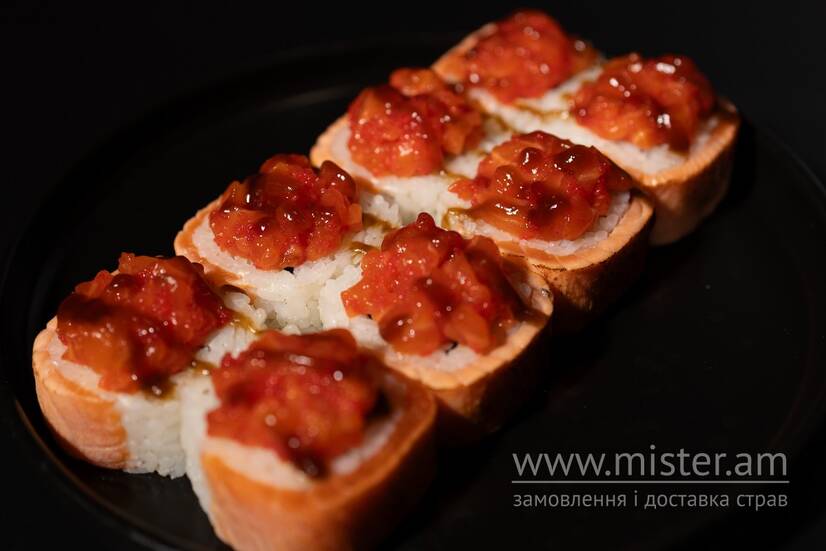 Обпалений лосось, крем-сир, огірок, тар-тар з лосося з соусом шрірача, ікра тобіко, соус унагі.