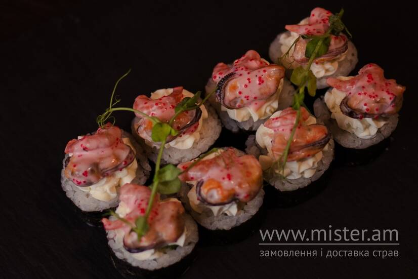 Рис, норі, краб, огірок, крем-сир, креветки та мідії в сирно-ікорному соусі.