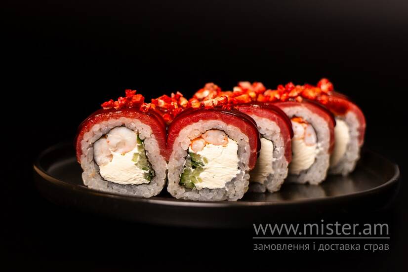 Рис, креветка тигрова, крем-сир, огірок, тунець, сублімована полуниця, соус унаг.