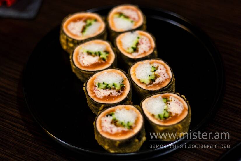 Норі, свіжий лосось, краб, огірок, рис, цибулевий кранч, кляр, обсмажений у фритюрі.
