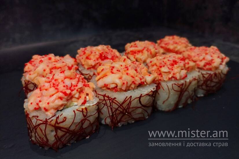 Рис, норі, крем-сир, огірок, креветка тигрова, соус шрирачі, ікра тобіко, стружка чилі.