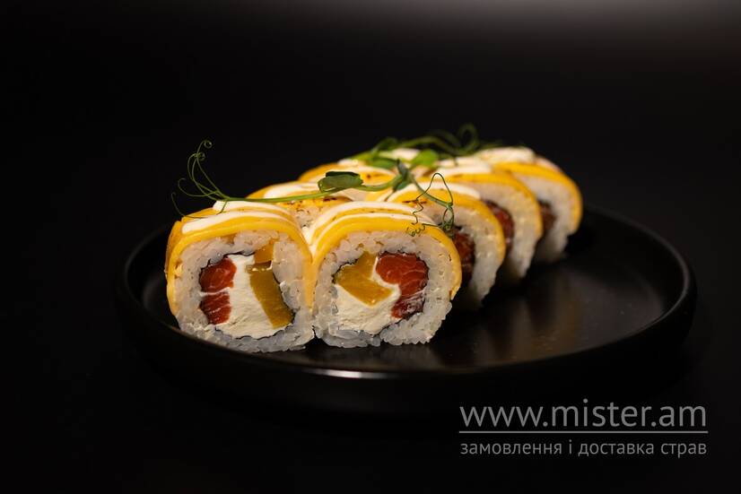 Свіжий лосось, крем-сир, манго, сир чеддер та сирний соус в поєднанні з рисом, має ніжний і вершковий смак.