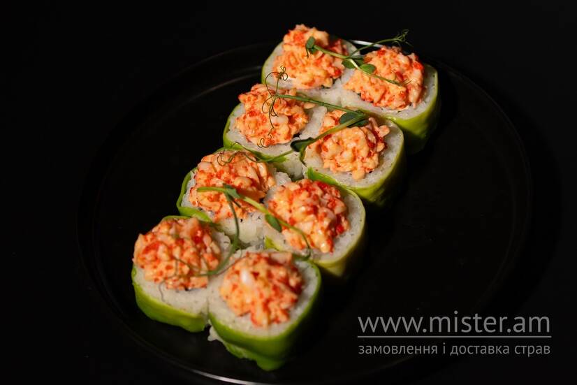 Рис, крем-сир, огірок, ніжна креветка з соусом шрірача, авокадо, ікра тобіко.