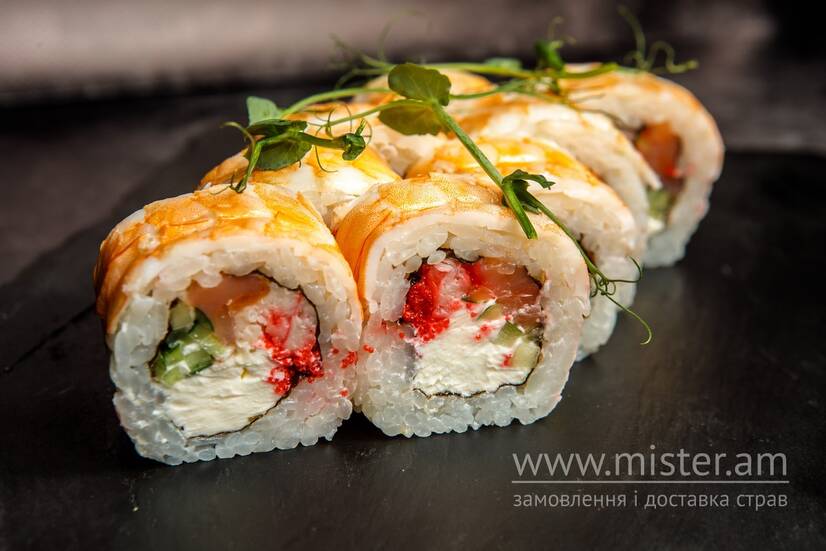 Рис, норі, крем-сир, огірок, ікра тобіко, лосось копчений, краб, креветка тигрова.