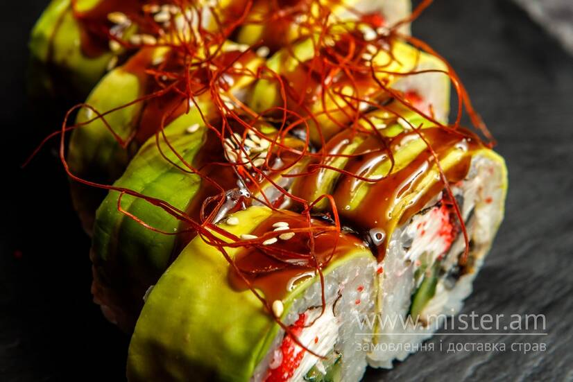 Рис, норі, крем-сир, огірок, авокадо, вугор, ікра тобіко, соус унагі, кунжут.