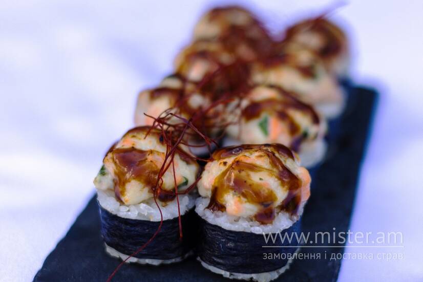 Рис, норі, крем-сир, лосось, шпинат, сир Дорблю, моцарела, соус унагі.