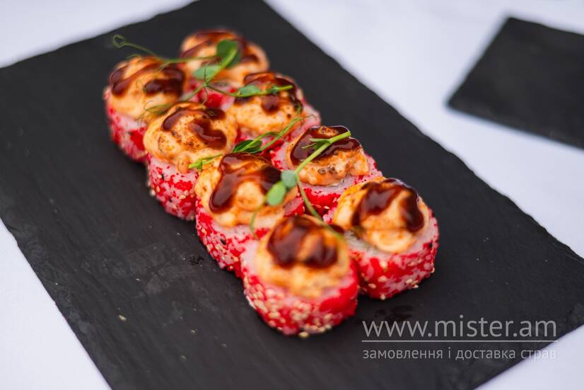 Рис, норі, крем-сир, огірок, вугор, сир моцарела, ікра Тобіко, кунжут, соус Унагі.