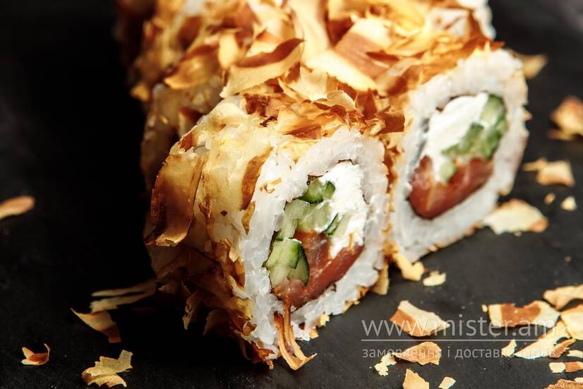Рис, норі, крем-сир, огірок, лосось копчений, стружка тунця.