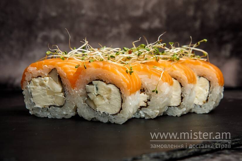 Рис, норі, крем-сир, груша, сир дорблю, лосось.