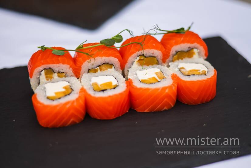 Рис, норі, крем-сир, манго, свіжий лосось.