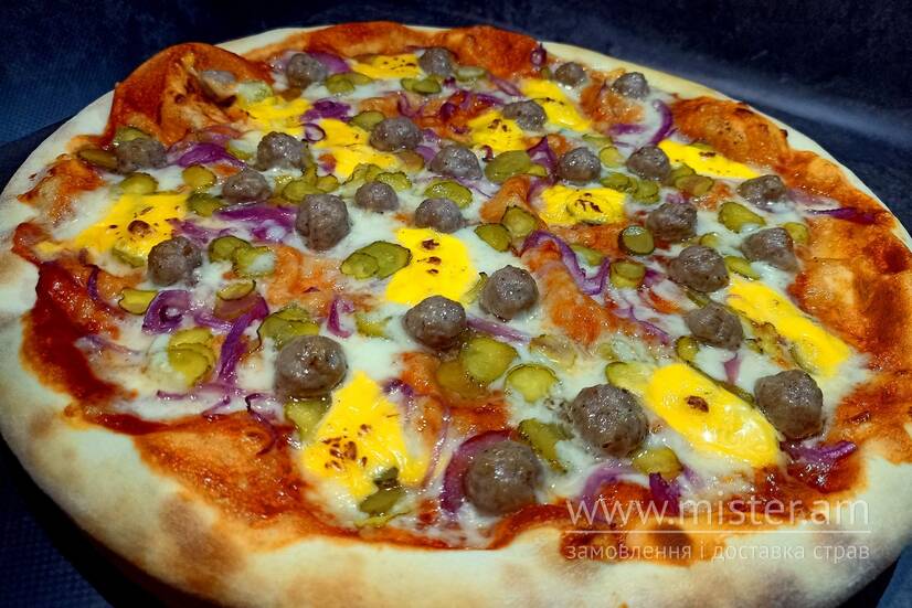 Тісто, фірмовий червоний соус, моцарела, м'ясні кульки, цибуля червона маринована, корнішони мариновані, сир чеддер.