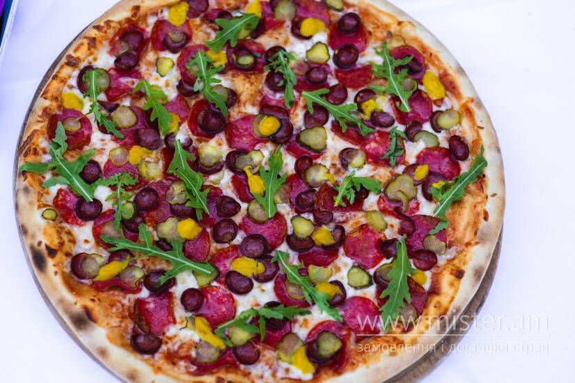 Тісто, соус червоний фірмовий, моцарела, мисливські ковбаски, салямі, корнішони мариновані, гірчиця американська (солодка), руккола.