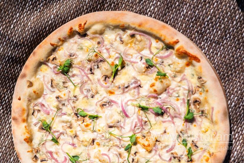 Тісто, вершковий соус, сир моцарела, гриби печериці, цибуля червона маринована, сир дорблю.
