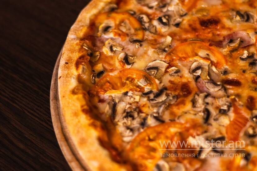 Тісто, соус червоний фірмовий, моцарела, гриби печериці, бекон, помідор.
