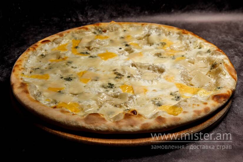 Тісто, вершковий соус, моцарела, сир дорблю, пармезан, чеддер.