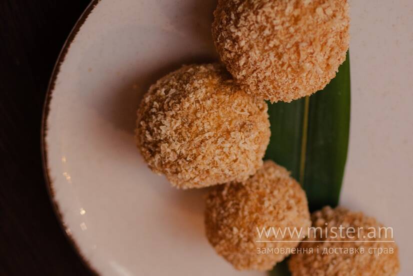 Рис, лосось, сир чеддер, кляр, сухарі Панко.