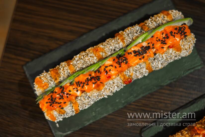 Рис, норі, крем-сир, авокадо, свіжий лосось, кунжут, соус sweet-чилі.