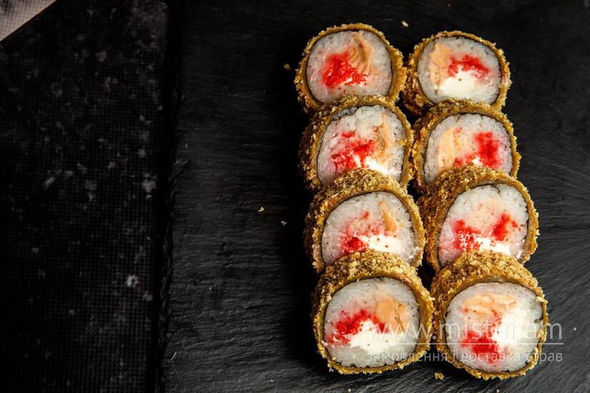 Рис, норі, крем-сир, ікра тобіко, лосось, краб, кляр, сухарі Панко.