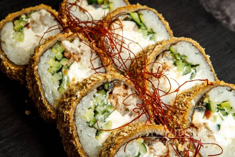Рис, норі, крем-сир, огірок, вугор, кляр, сухарі Панко.