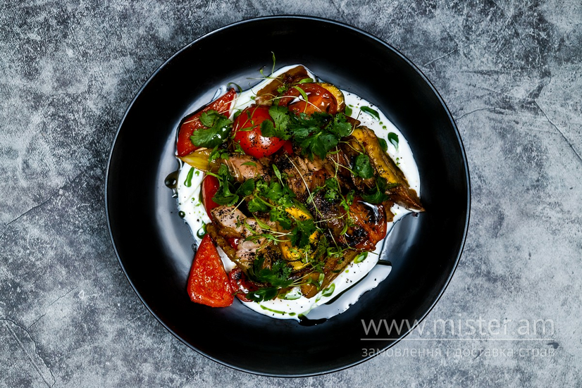 Томлений барашка, томати чері, айолі, підсмажені на вогні цукіні, баклажани, болгарський перець, цибуля ріпчаста і картопля.