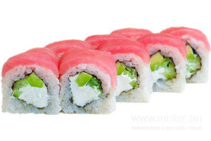 Поєднання смаків свіжого тунця з крем-сиром, хрустким огірком, авокадо і норі, унагі соусом та мигдальними пластівцями.